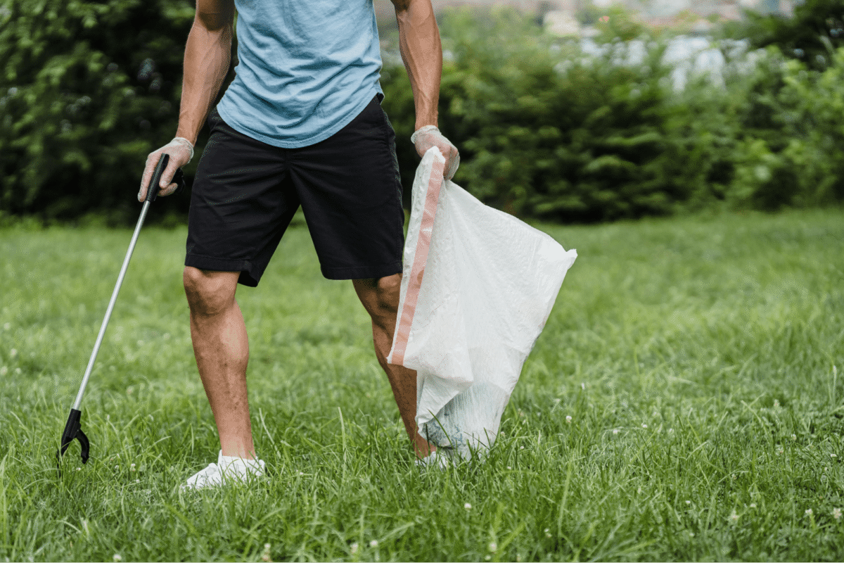 Image: man picks litter at a park.